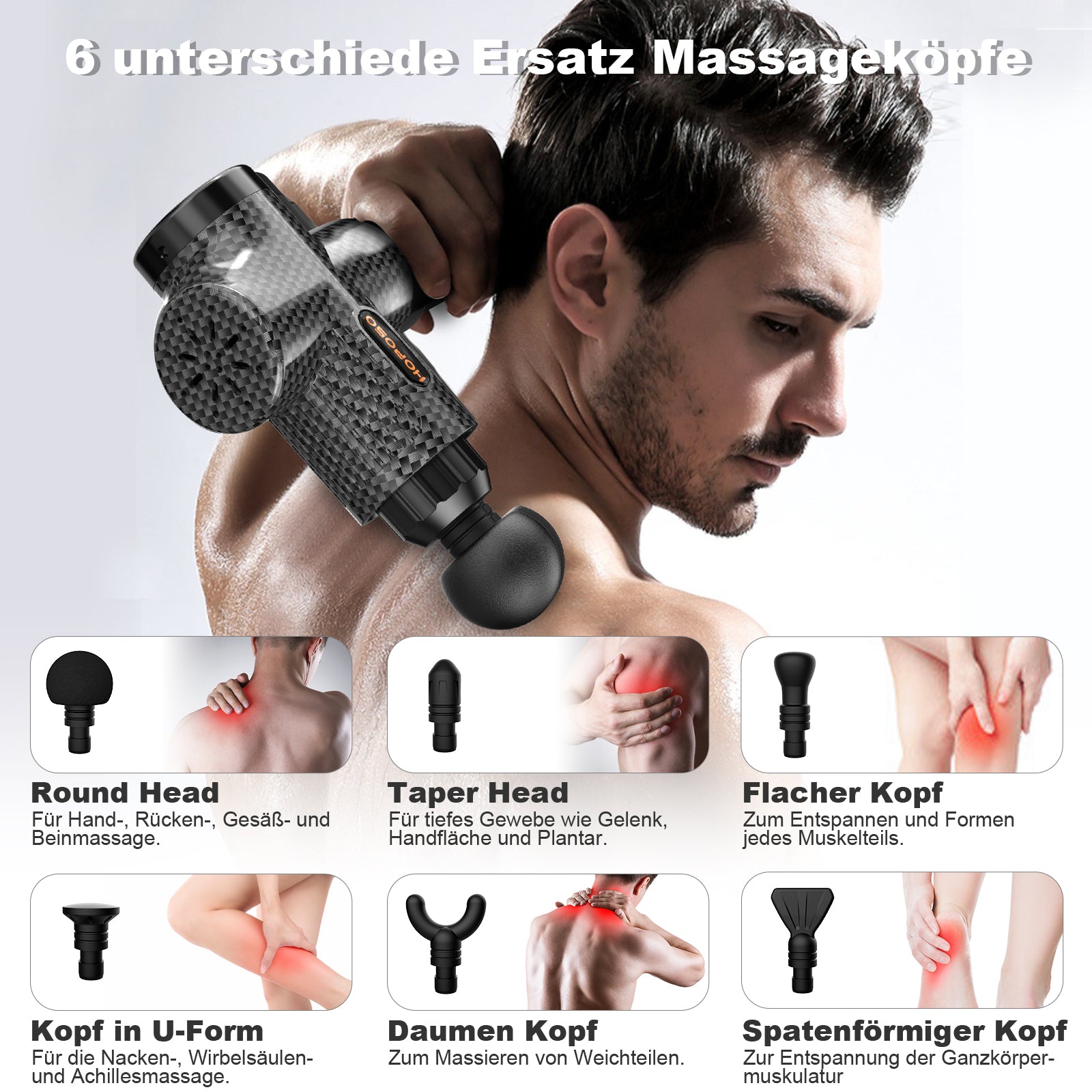 - 6 cabezales de masaje. Nuestra pistola de masaje muscular es amada por atletas, terapeutas y todos los que han probado nuestra pistola de masaje. Ajustamos nuestra pistola de masaje a un máximo de 4800 rpm y hay 6 cabezales de masaje diferentes. Cada cabeza relaja diferentes partes del cuerpo y proporciona un tratamiento específico para cada grupo muscular.