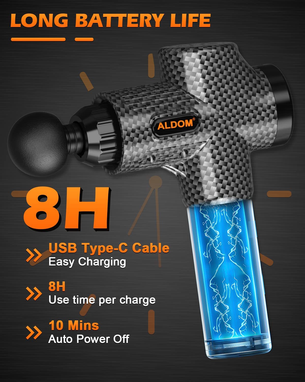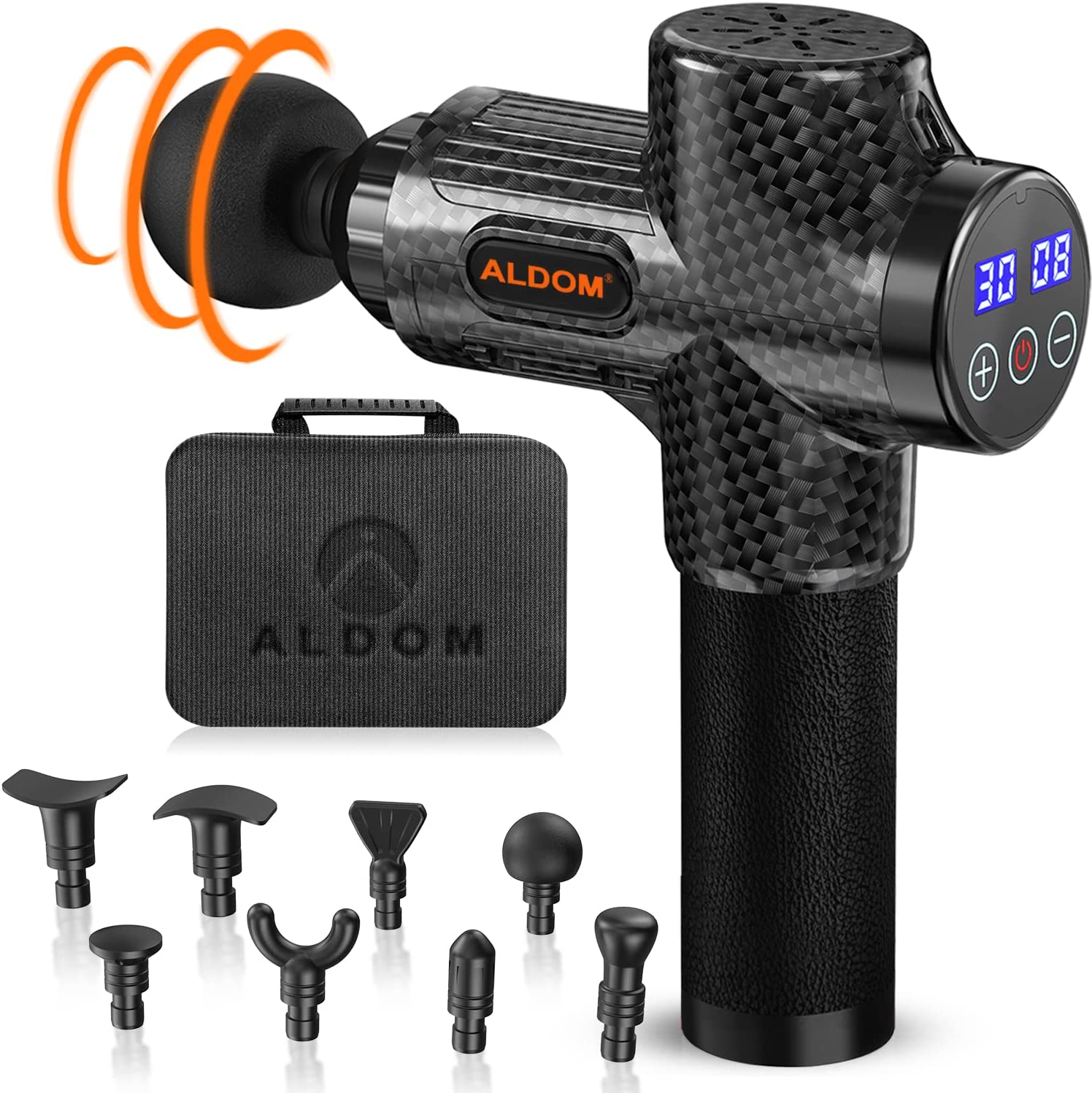- POWERFUL DEEP TISSUE MASSAGER GUN – ALDOM Massage Gun that helps relieve muscle aches, soreness and stiffness, gun massager promote blood flow and relieve lactic acid and helps accelerate warm up and recovery, plus, Handheld Massage Gun helps restore the body faster, Deep muscle massager gun take your percussion massager to the gym or sports club, convenient single-handed operation with a comfortable grip, quickly relieve muscle fatigue and pain, accelerate recovery.
