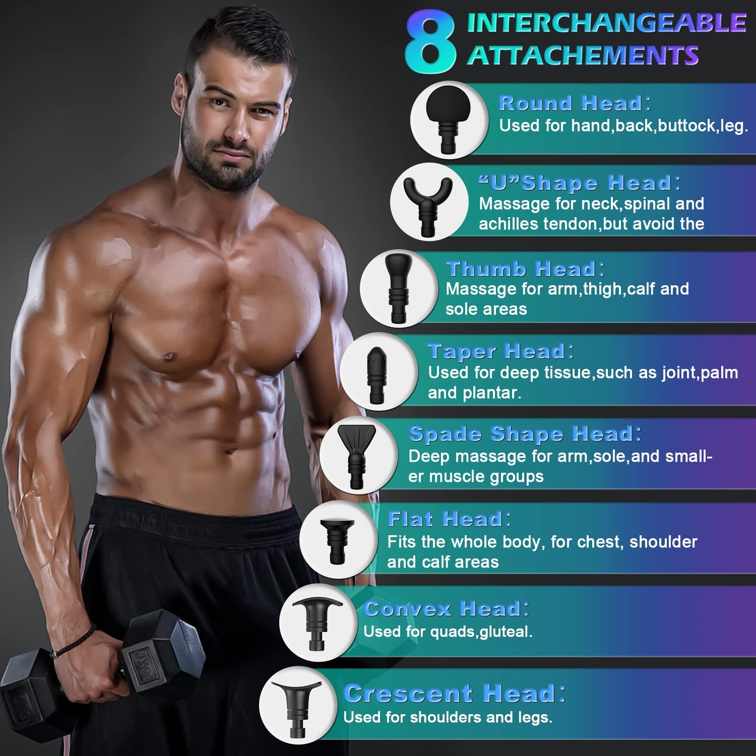 - 【8 MASSAGE HEADS】This handheld muscle massage gun is equipped 8 different functional massage heads to match different body parts. Round -- relaxing muscle groups; Taper -- massage joint; ‘U’ Shape -- neck and spine; Flat -- full body massage; Thumb -- foot sole massage; Spade -- small muscle of neck, Leg, shoulder massage; Crescent -- shoulders and legs; Convex -- quads, gluteal.