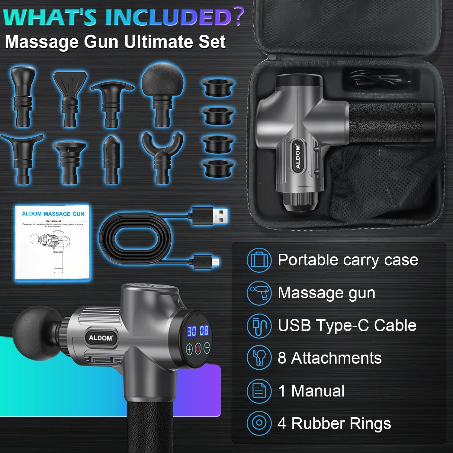 Massage Gun, ALDOM Massage Gun Deep Tissue Handheld Muscle Massage Gun 30 Speeds Deep Tissue Muscle Massager Percussion Massager with 8 Heads Powerful Muscle Gun for Athletes, Back Neck Massager
