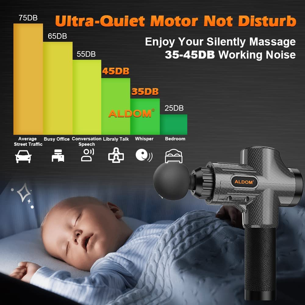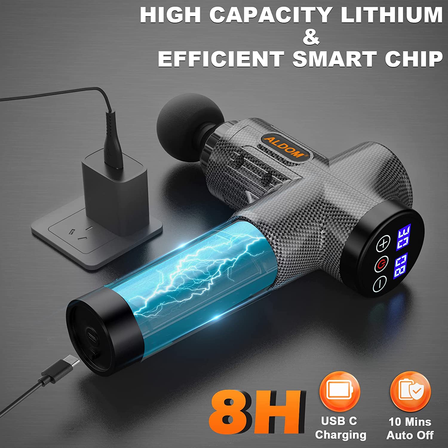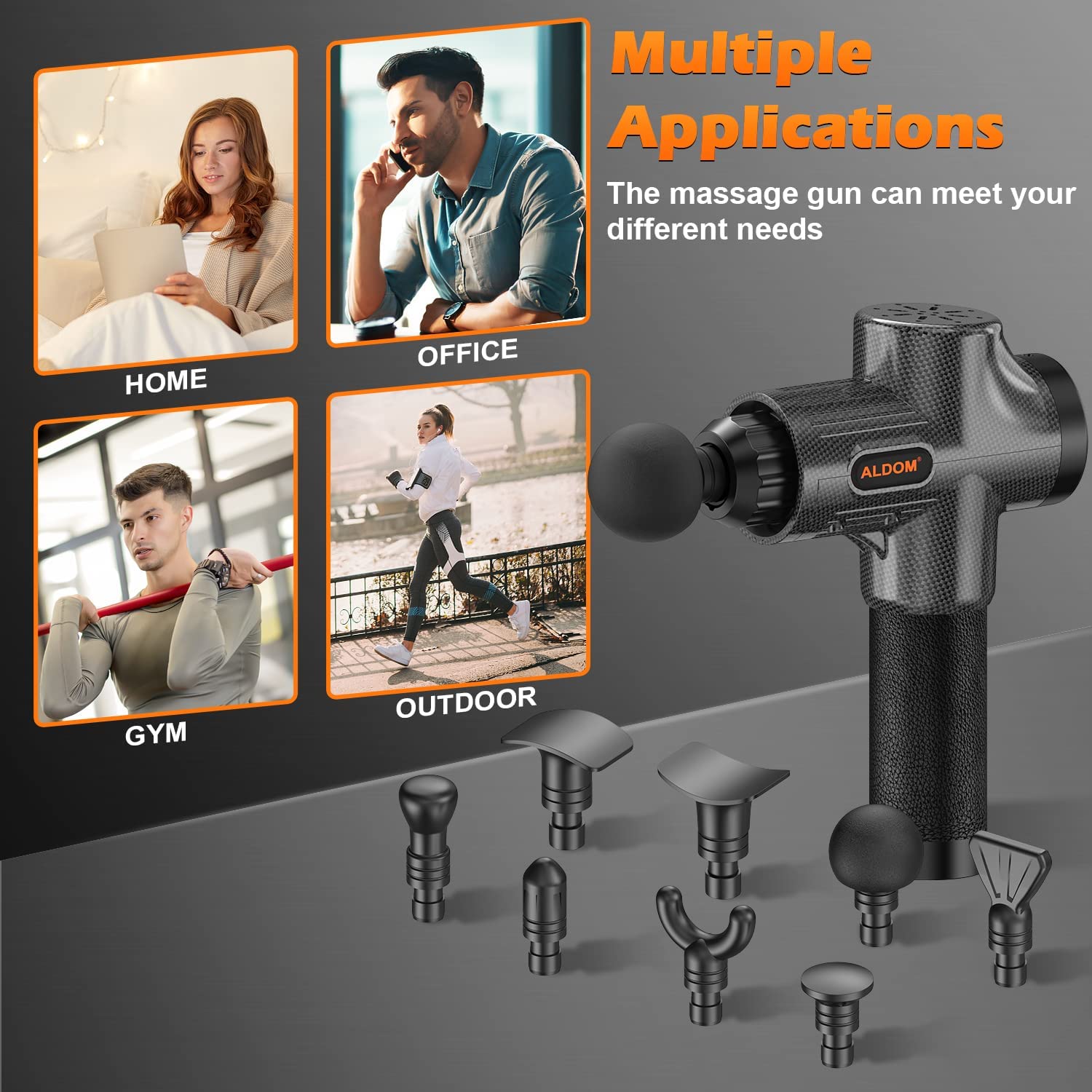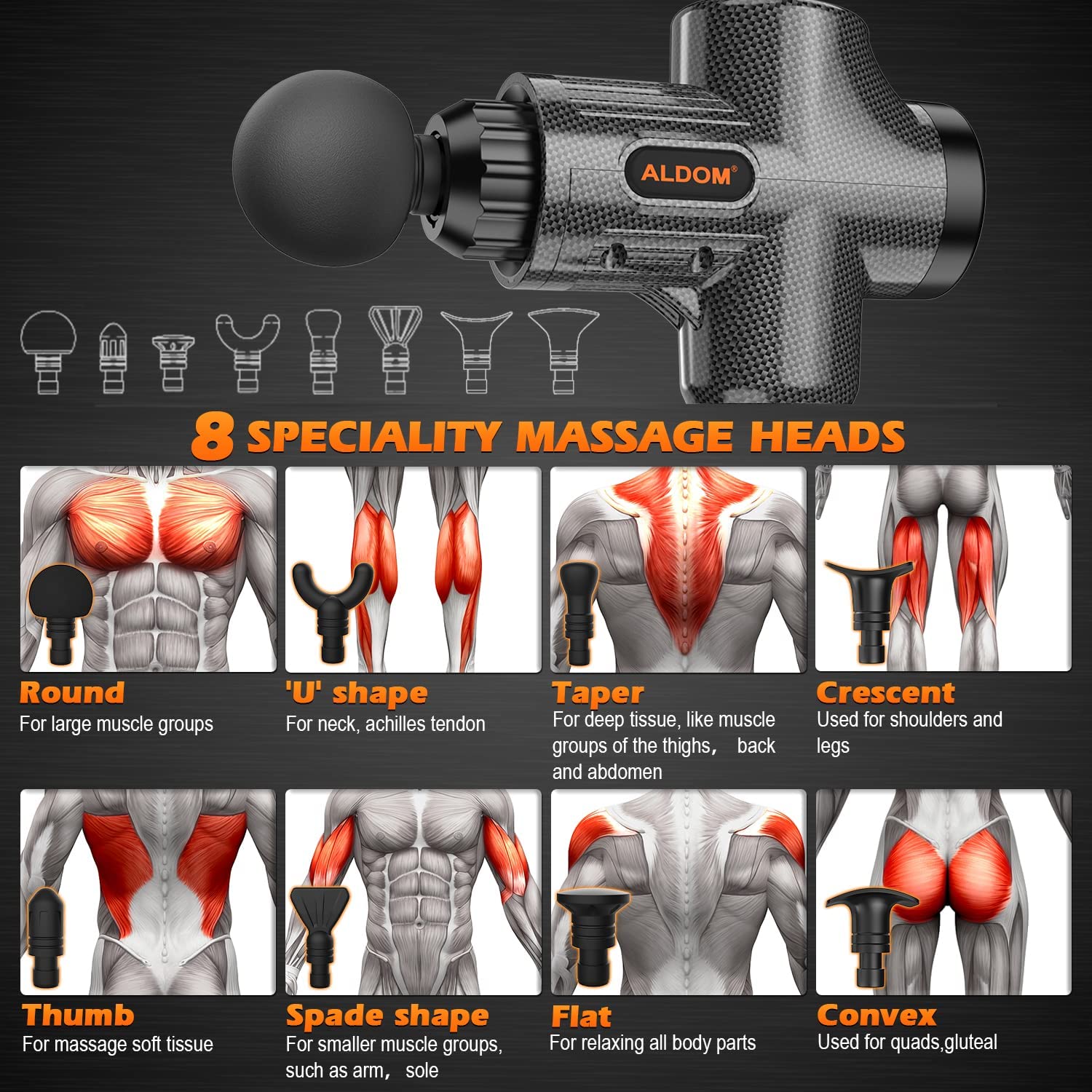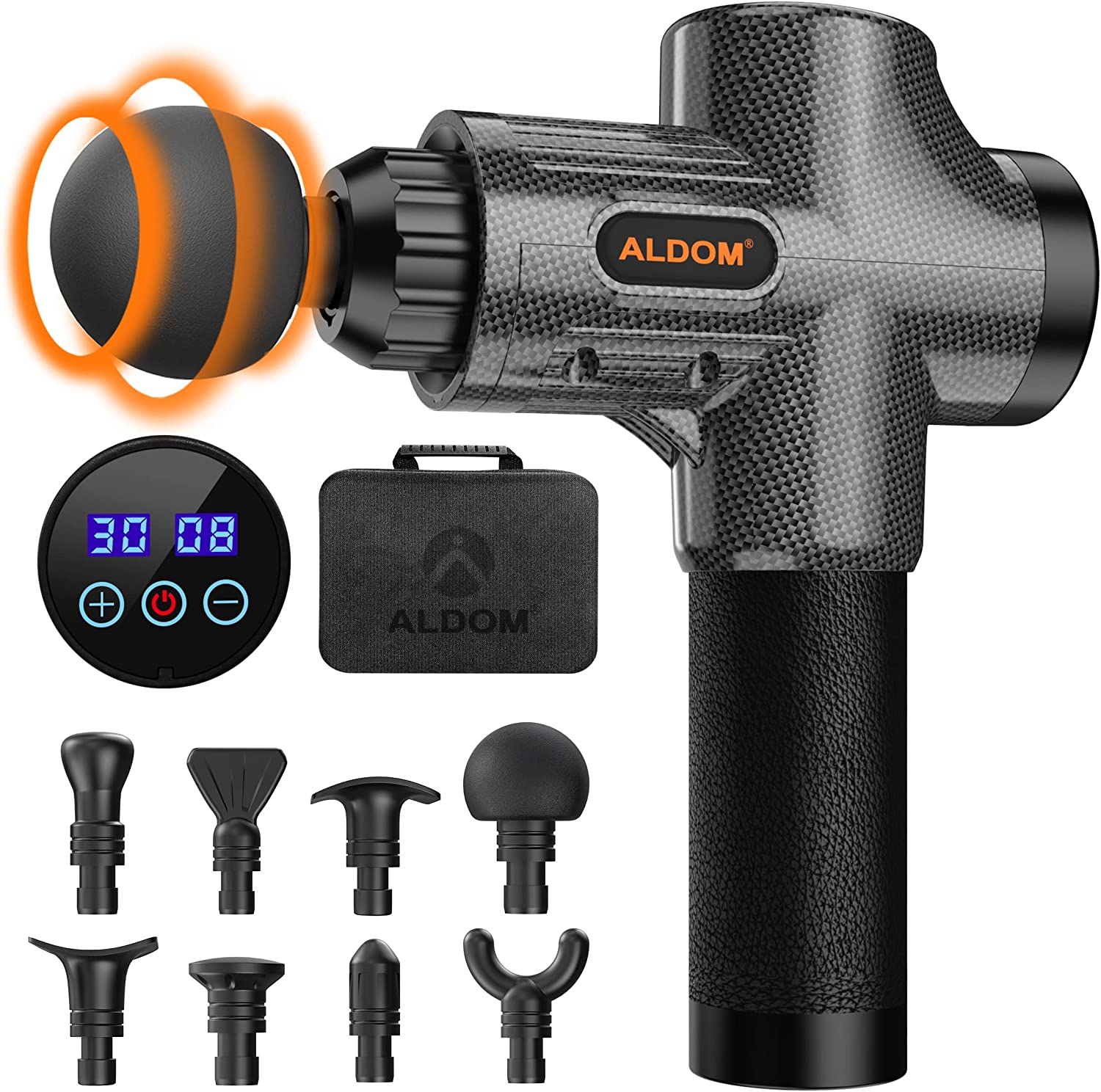 - Professional Percussion Massager: ALDOM massage gun adapts percussion therapy to relieve muscle soreness and accelerate recovery. Meanwhile this muscle massager efficiently helps relax your muscles stiffness, promotes blood flow and relieves lactic acid fastly, provides you with professional relaxing massage like the massagist does.