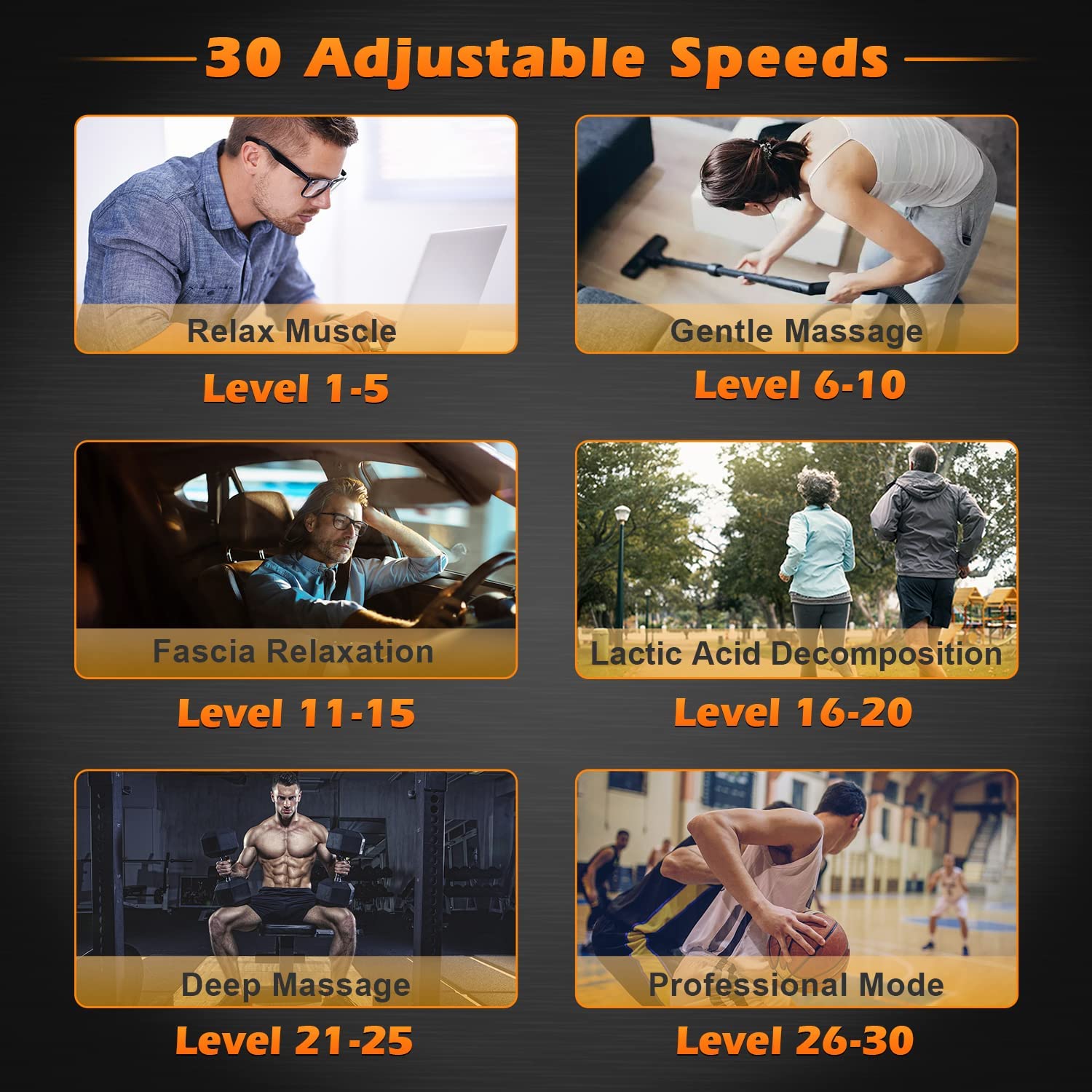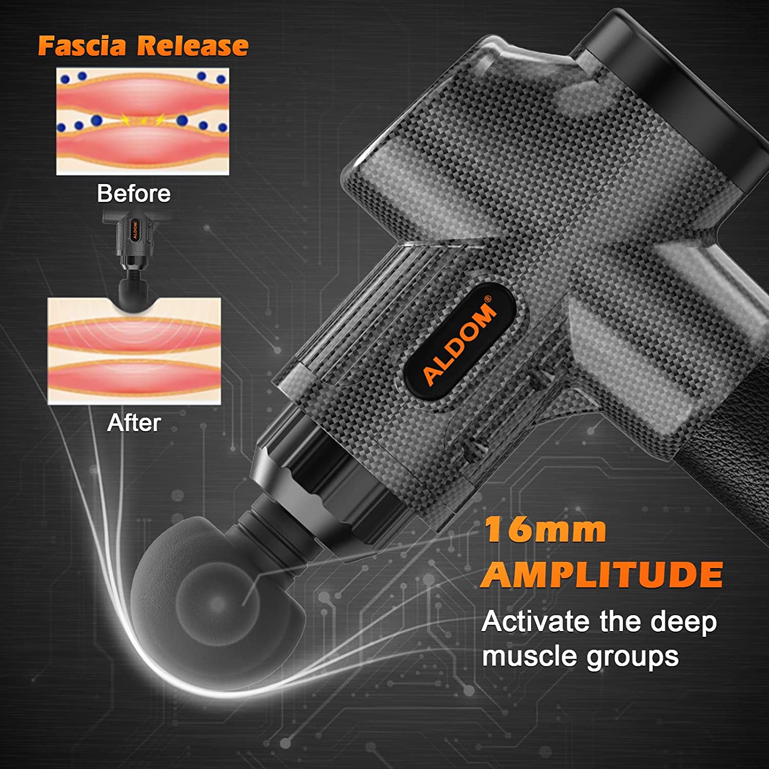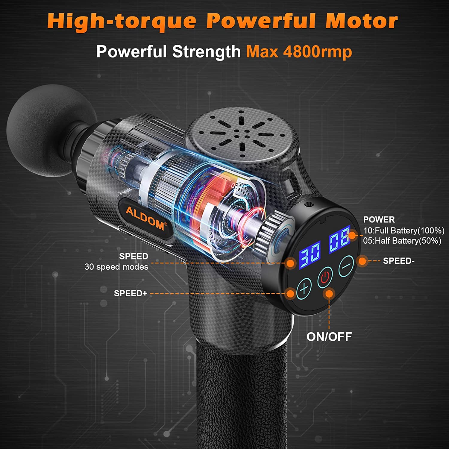 - 30 Speed Options and 16mm Amplitudes: 16mm amplitude make it more powerful and effective to deep tissue muscle, to meet different massage needs for different people, ALDOM massager gun have 30 different massage level options. 1800-4800 strokes per minute depending on the speed you select, easily adjust the massage speed through the LCD touch control, perfect for beginner, athlete bodybuilders, office worker&eldery.