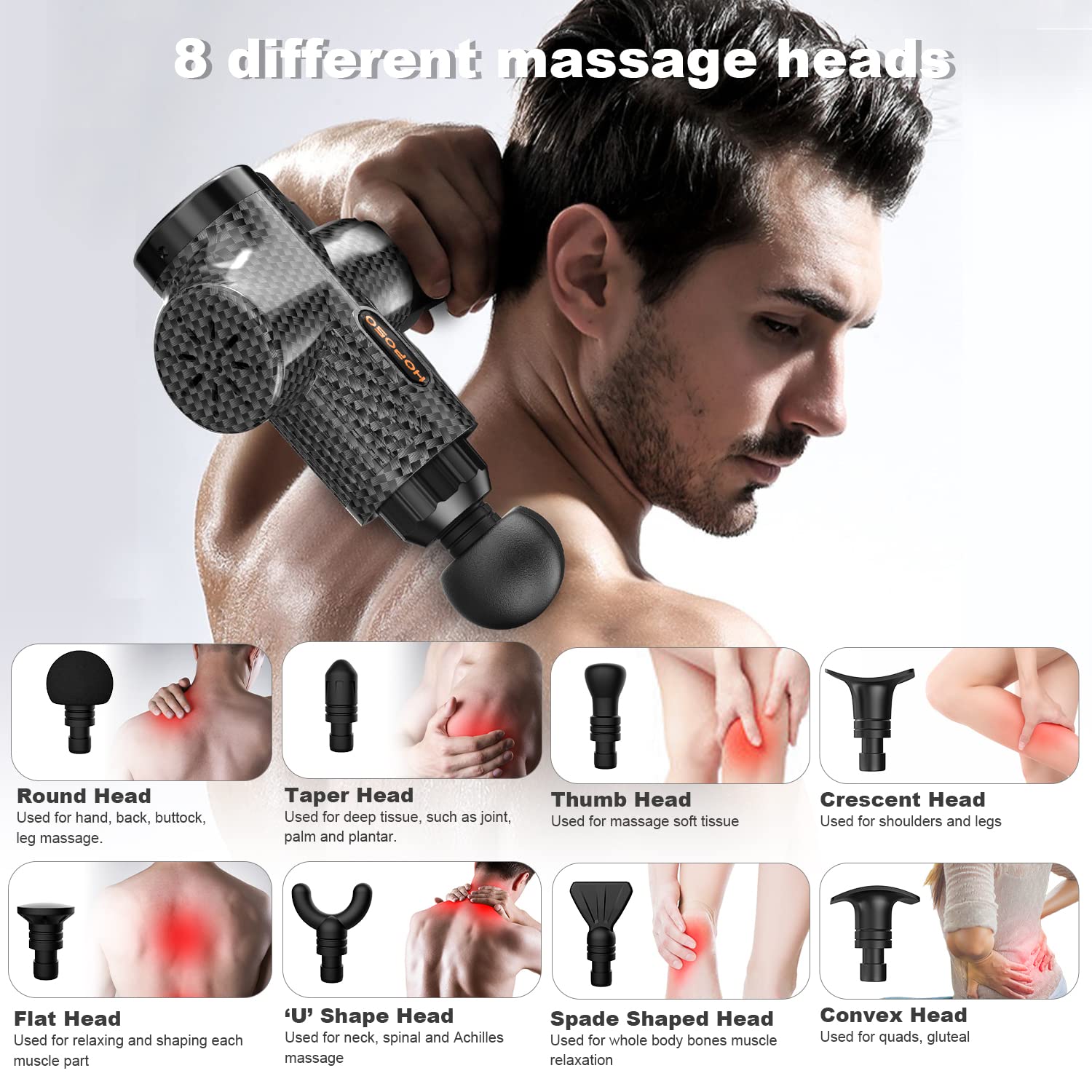 - 💪【8 REPLACEABLE MASSAGE HEADS】The deep tissue massage gun which offers 8 customized massager heads,provides a relaxing massage experience.Activate the muscles.Stimulate blood flow,greatly reduce muscle recovery time,and relieve pain from head to toe.