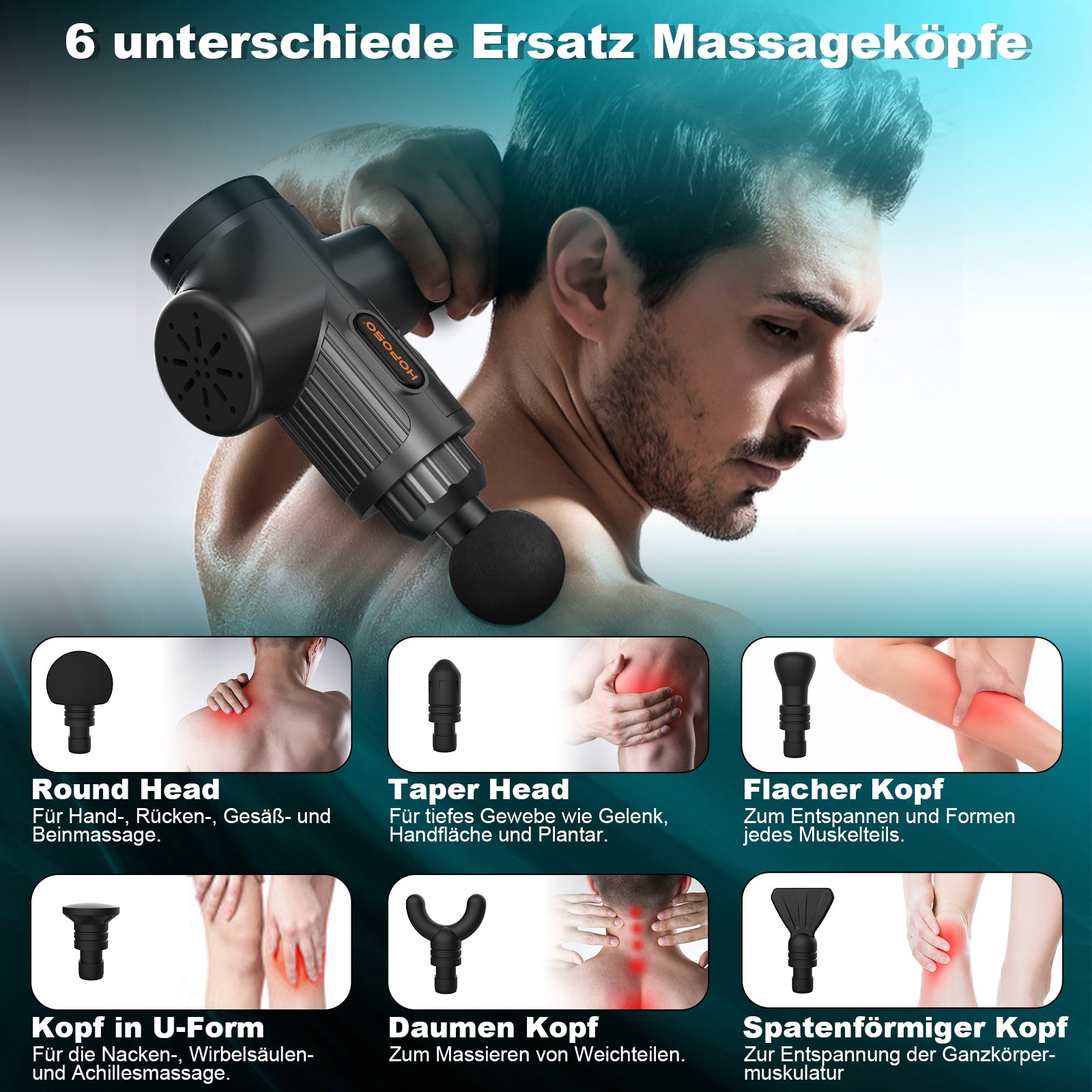- 30 ajustes de velocidad y 8 cabezales de masaje: hemos aumentado las velocidades de masaje a 30 niveles. De esta manera, puedes ajustar la velocidad y obtener un masaje más adecuado y cómodo. Ajustamos nuestra pistola de masaje a un máximo de 4800 rpm y hay 8 cabezales de masaje diferentes. Cada cabeza relaja diferentes partes del cuerpo y proporciona un tratamiento específico para cada grupo muscular.
